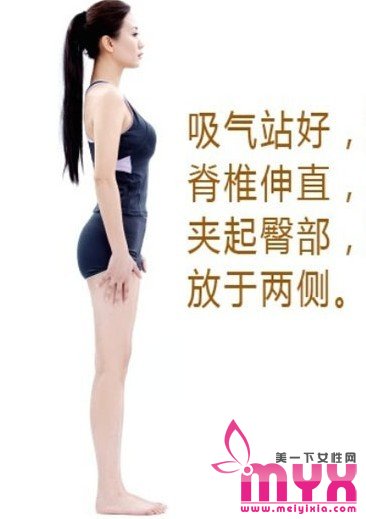 动作一:吸气站好,双脚并拢,脊椎伸直,收紧小腹,夹起臀部,双手自然垂放与两侧。